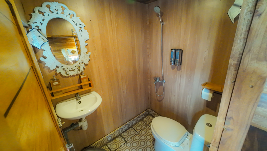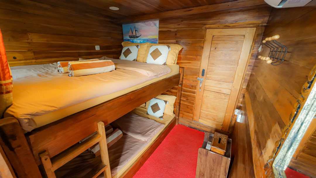 – Lower Deck (Private Cabin – Padar, Rinca, Komodo, Siaba) : Max Capacity 2 Pax, Double Bed with AC, Share Bathroom with Water Heater.