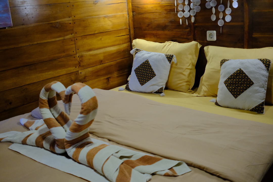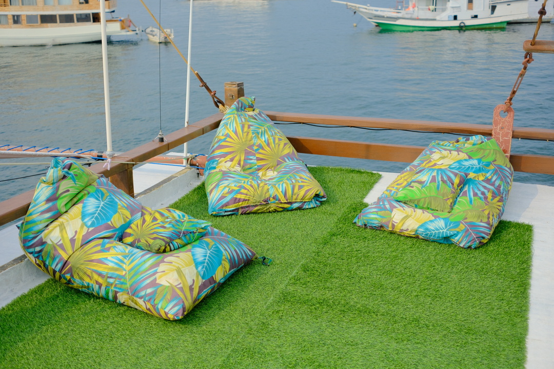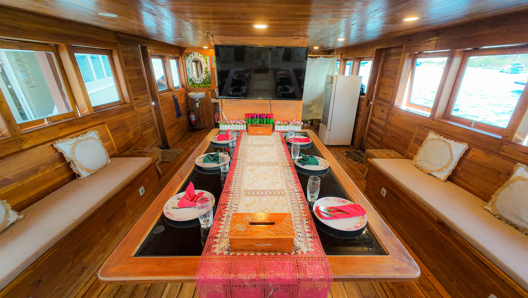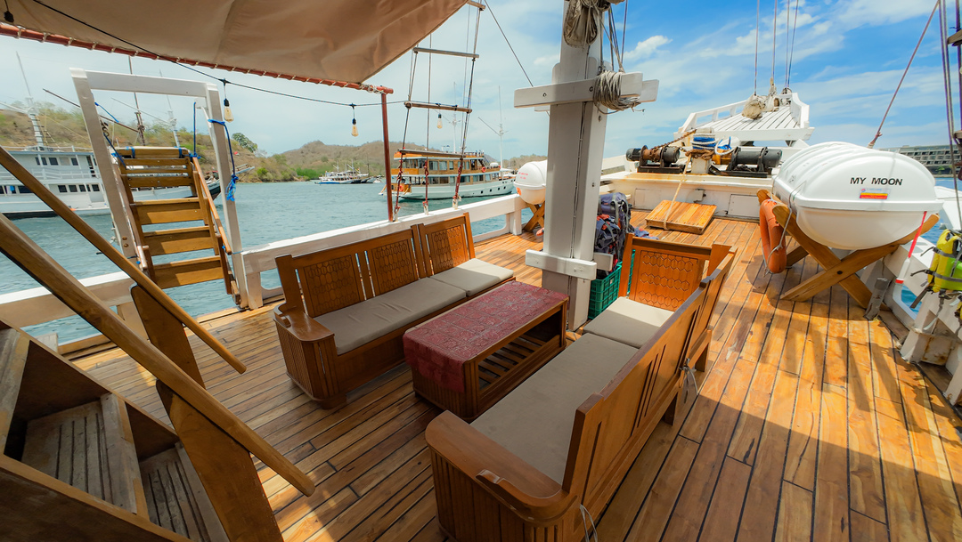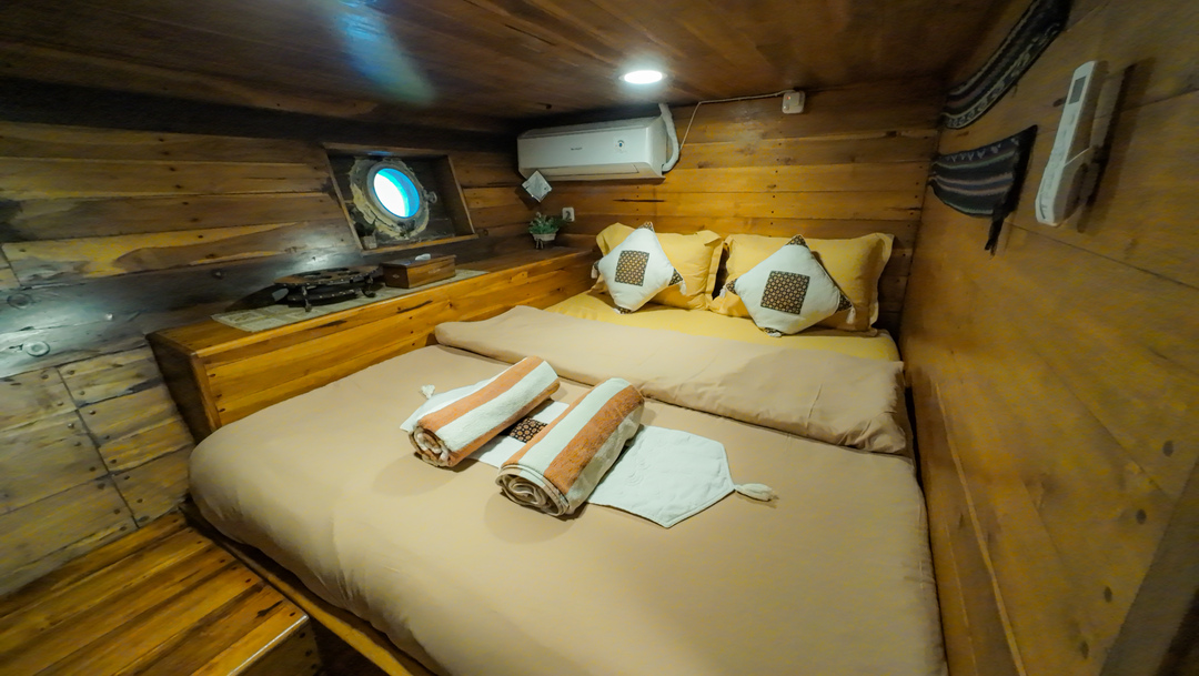 – Main Deck (Master Cabin – Gili Lawa) : Max Capacity 2 – 3 Pax, Queen-size Bed with AC, Private Bathroom with Water Heater, Ocean View Cabin.